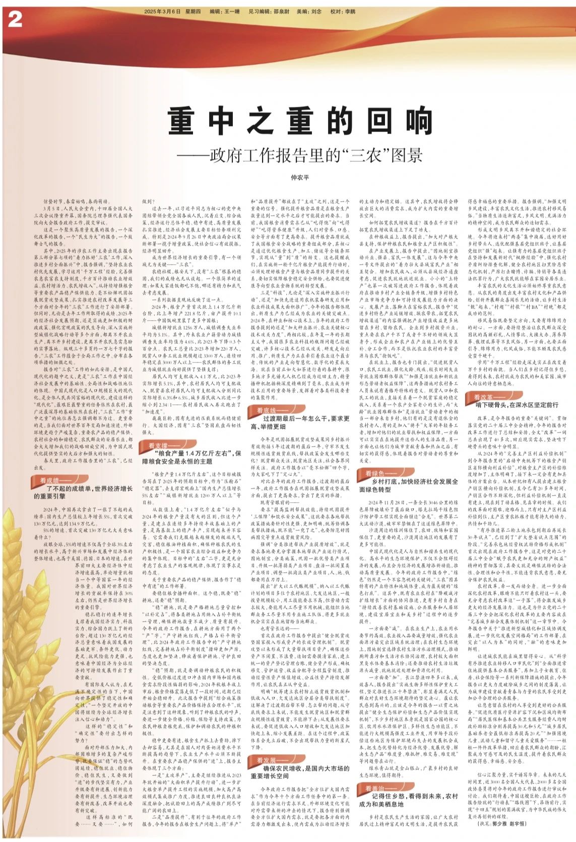 其中,2025年的涉农工作主要出现在报告第三部分第七项的“着力抓好‘三农’工作,深入推进乡村全面振兴”中,报告强调,“坚持农业农村优先发展,学习运用‘千万工程’经验,完善强农惠农富农支持制度,千方百计推动农业增效益、农村增活力、农民增收入”,从持续增强粮食等重要农产品稳产保供能力、毫不松懈巩固拓展脱贫攻坚成果、扎实推进农村改革发展等三个方面对全年的“三农”工作进行了安排部署。但同时,无论是去年工作所取得的成绩、2025年的经济社会发展预期,还是实施更加积极的财政政策、强化宏观政策的民生导向、深入实施新型城镇化战略行动等多个方面,都离不开农业生产,离不开乡村建设,更离不开农民急需急盼的实事落地。纵观三十多页约一万七千字的报告,“三农”工作蕴含于全局工作之中、分布在各项举措的细微之处。
