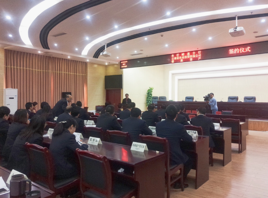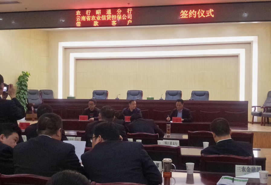 2018年4月17日,云南省农业信贷担保有限公司昭通办事处与中国农业银行昭通分行共同举行借款客户签约仪式。农业银行昭通分行党委书记蒋学才,分行各部门负责人、各县区行长、信贷经理,农业信贷担保公司昭通办事处人员及借款客户参加了此次签约仪式。