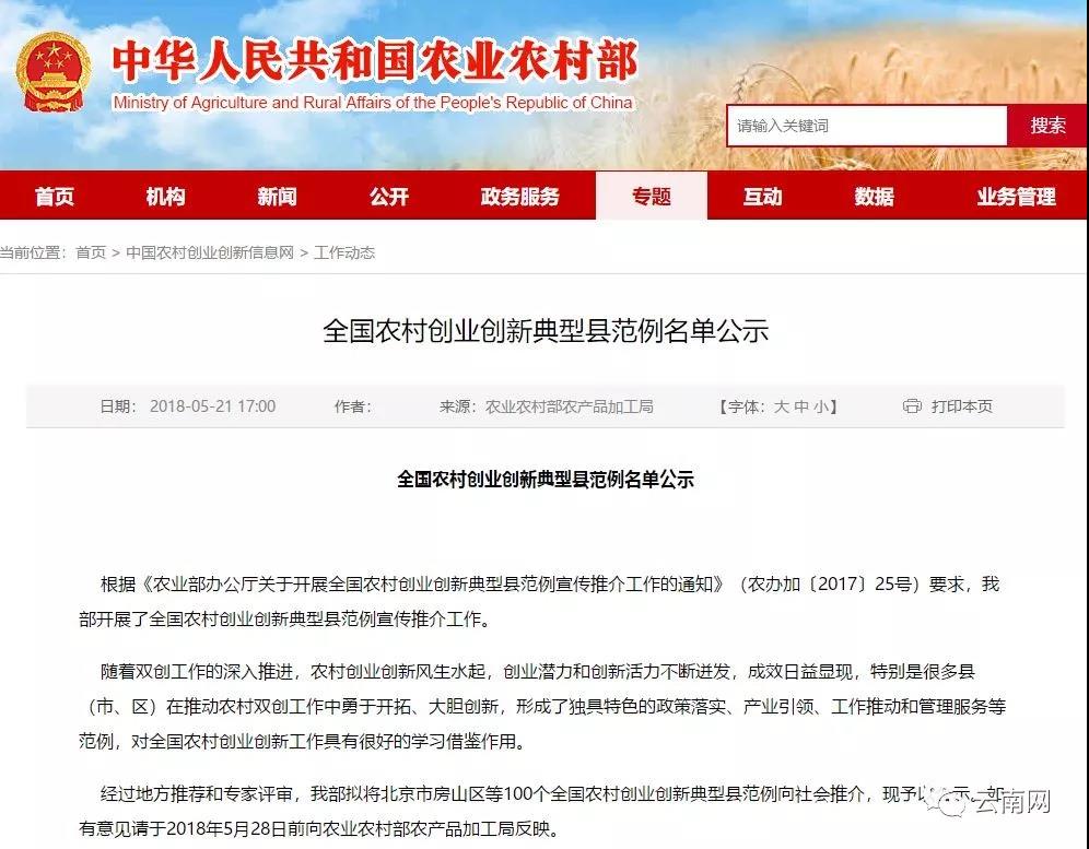 经过地方推荐和专家评审,农业农村部拟将北京市房山区等100个全国农村创业创新典型县范例向社会推介,现予以公示。
