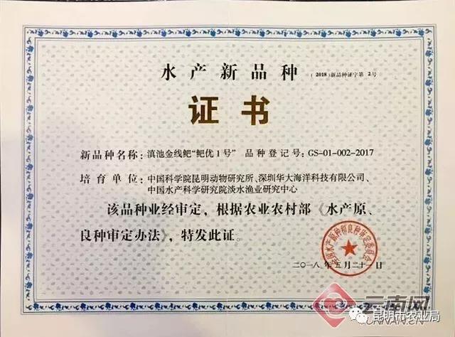 日前,由中国科学院昆明动物研究所联合深圳华大海洋科技有限公司、中国水产科学研究院淡水渔业研究中心研发培育的新品种——滇池金线鲃“鲃优1号”,正式获农业农村部的官方认定,在水产种业发展论坛上获得农业农村部颁发的水产新品种证书。这标志着滇池金线鲃有望实现规模化商业养殖。