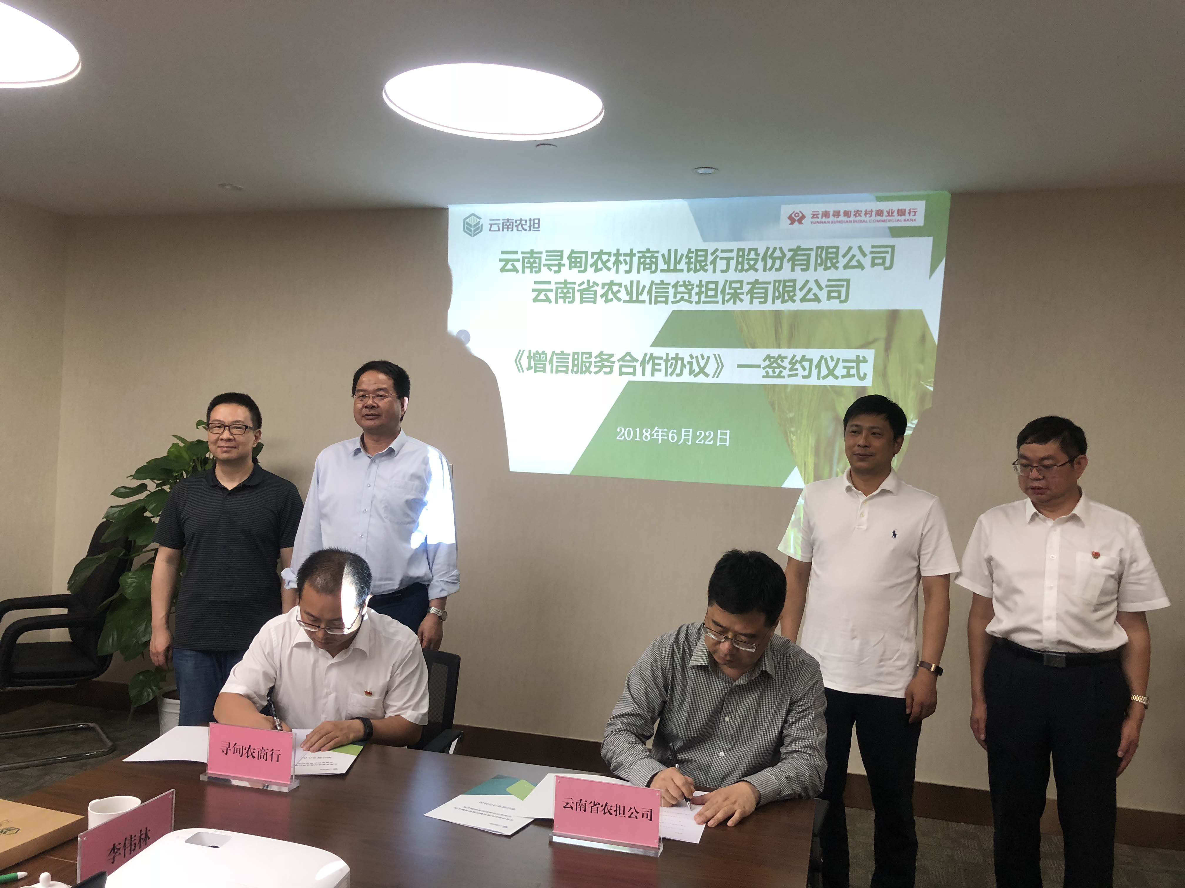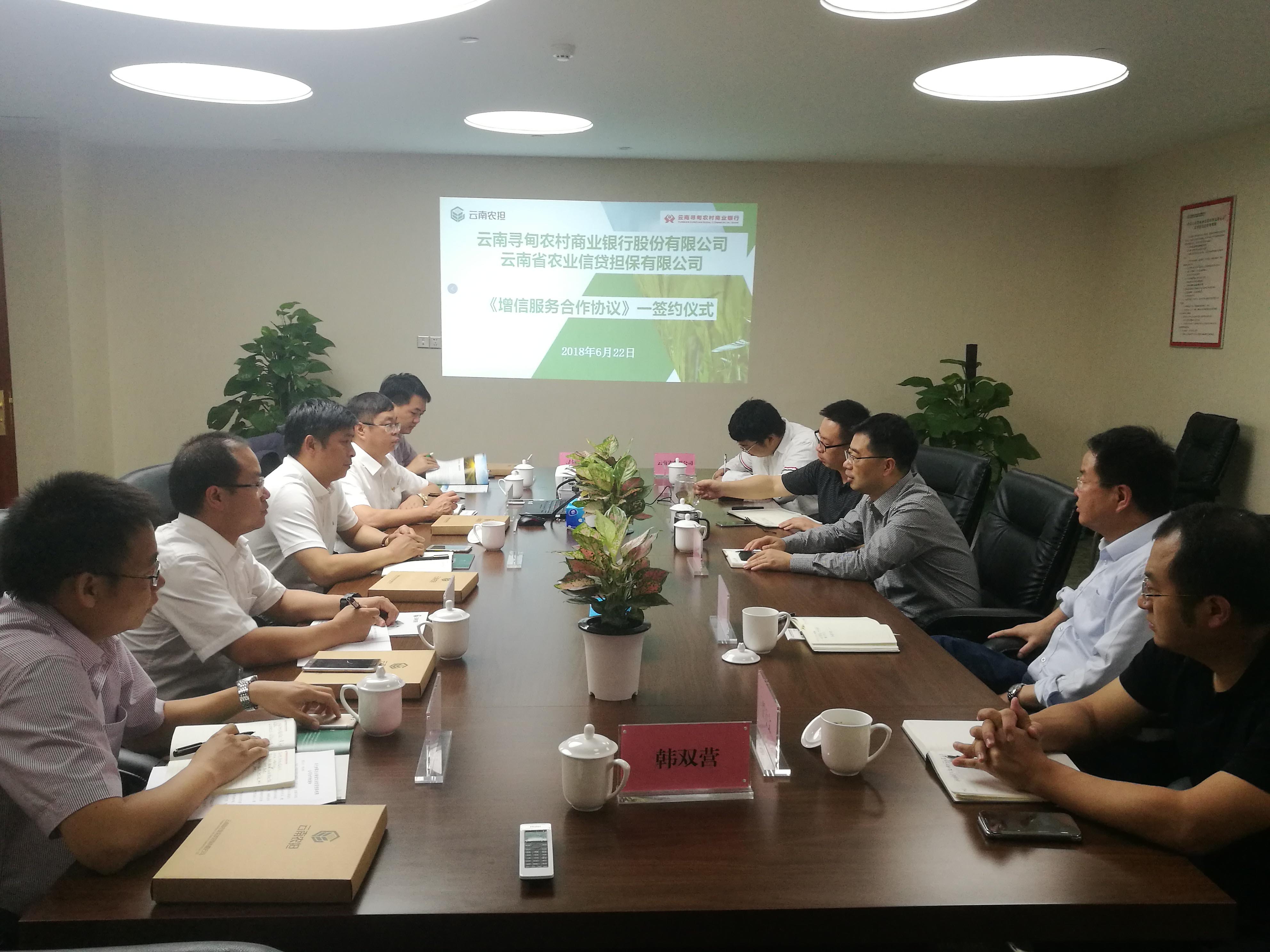 6月22日下午,为认真贯彻落实《中共中央 国务院关于实施乡村振兴战略的意见》(中发〔2018〕1号)和省委、省政府关于发展“三农"的决策部署,紧紧围绕“一村一品、一县一业”发展新格局,为缓解新型农业经营主体融资难、融资贵的问题,遵循合作共赢理念,整合各自优势,构建银担联合创新、联合推动、风险共担,省农担公司与寻甸县农村商业银行本着互惠互利、让利于农的原则,由寻甸农商行董事长虞燕林带队、行长李叶忠、副行长范彪等一行前往省农担公司与董事长郭影、总经理杜开波、副总经理廖寅皓、农担二部负责人贾万文等进行会谈,会议期间双方签署了寻甸县增信服务合作协议,为下一步业务开展打下了坚实的基础。