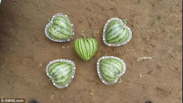 其实,形状各异的西瓜是靠模具压制而成的。当西瓜生长至幼瓜阶段时,将它们放置在方形、元宝形和心形的塑料模具中,生长期间,西瓜会一直受到模具挤压,在撤离模具后,就成了各式的形状。