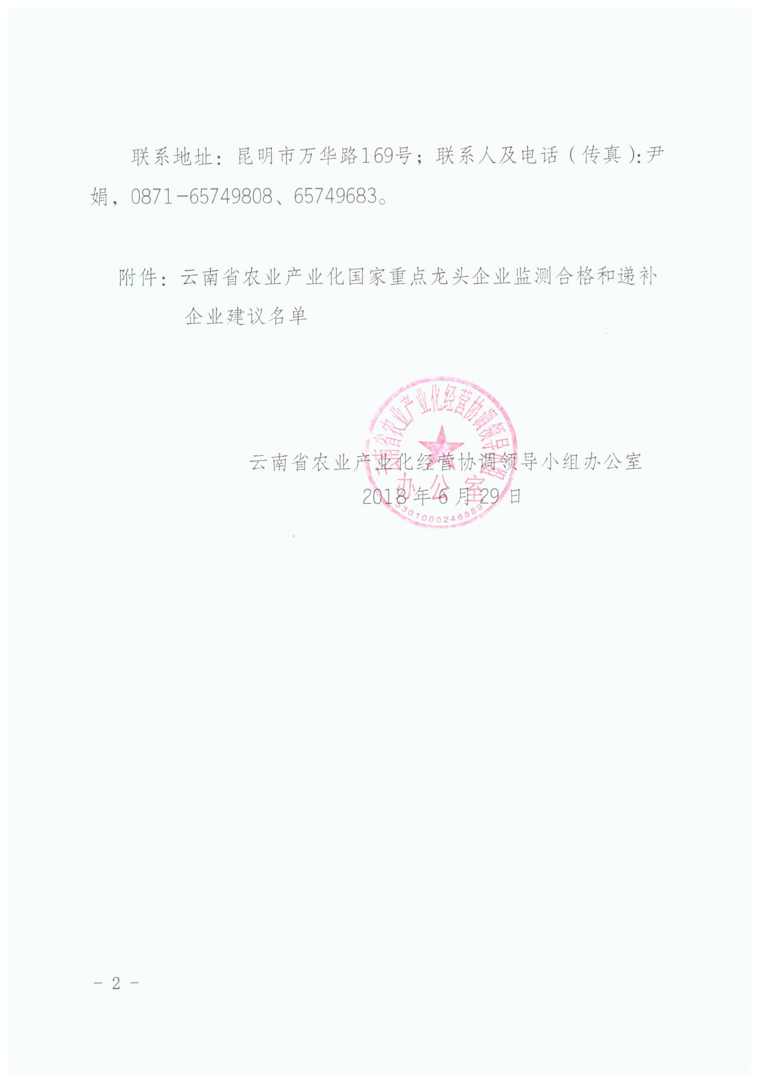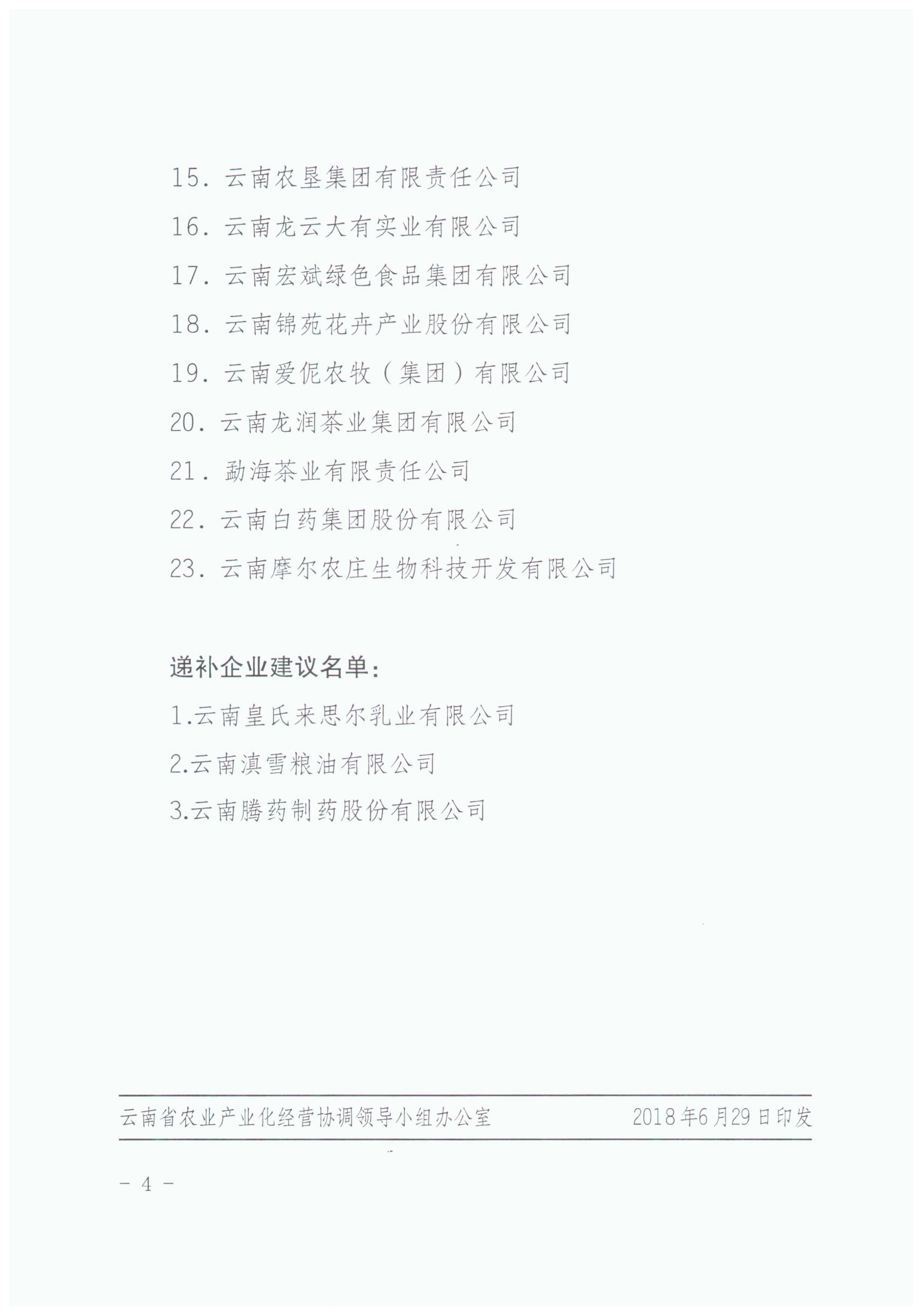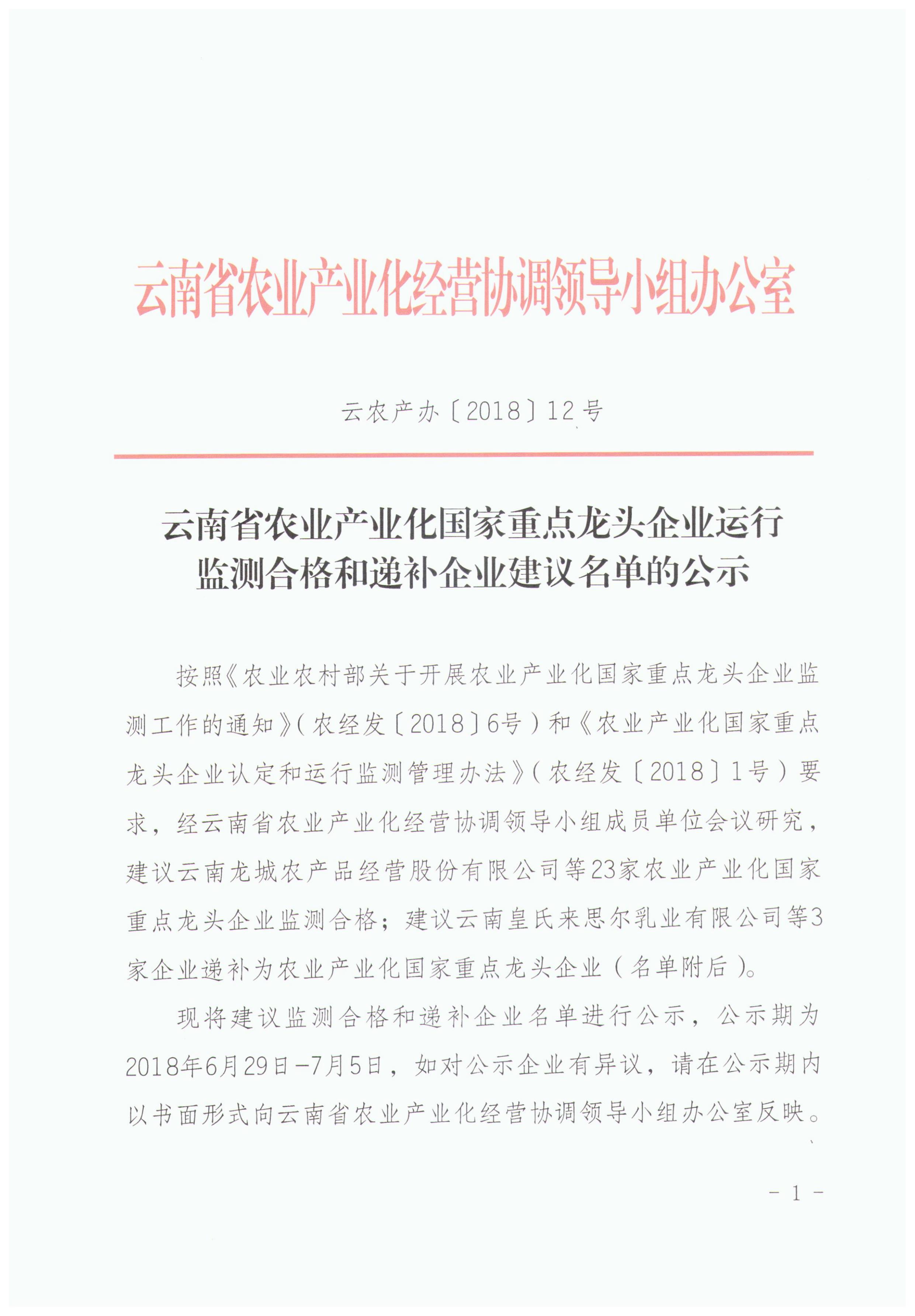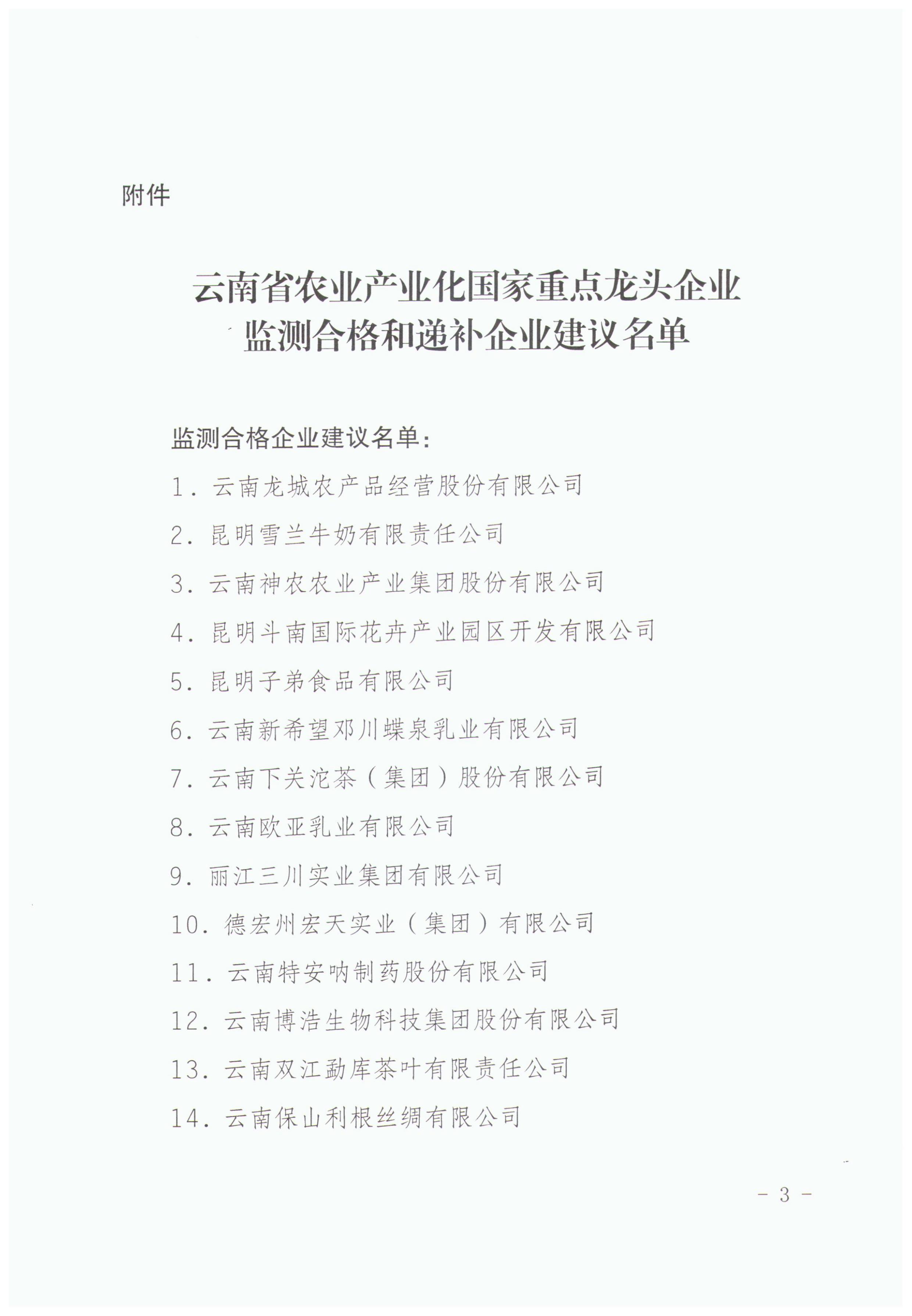 云南省农业产业化国家重点龙头企业运行监测合格和递补企业建议名单的公示