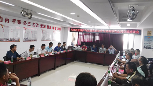 8月29日马来西亚维护与发展协会会长、皇室拿督蔡振行博士一行27人到昆明市农业局开展农业交流,市农业局倪淼副局长、局办公室、人事处、种植业处、畜牧处、市场信息处、质监处等相关处室人员参加座谈会。