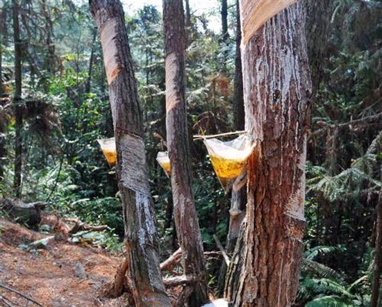 家住白沙村杨梅树组的杨忠宝,种植松树100亩,他告诉笔者:“松树一年四季都可以采割,现在我们学会了科学的采割技术,不仅松脂量增多了,松树也得到了有效保护,一年下来松脂收入有6万元,松脂成为了我们老百姓的‘绿色银行’”。