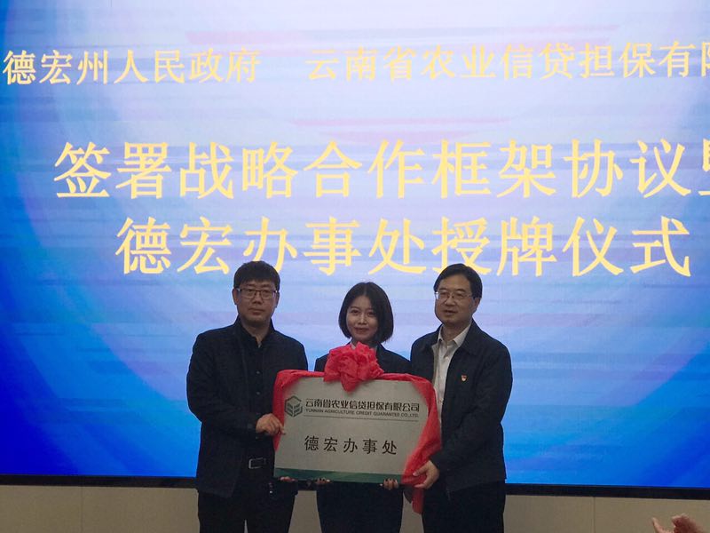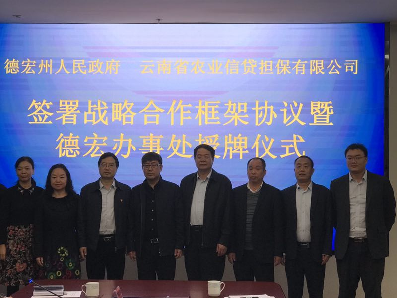 12月19日上午,德宏州人民政府、云南农担公司签署战略合作框架协议暨德宏办事处授牌仪式在芒市会堂举行。德宏州委常委、常务副州长马云峰,农担公司董事长郭影、总经理杜开波、机构部负责人蔡菲、德宏州财政局、农业局、人行德宏支行、德宏银监分局、农行德宏分行、省联社德宏办、各县市政府等相关单位参加会议。