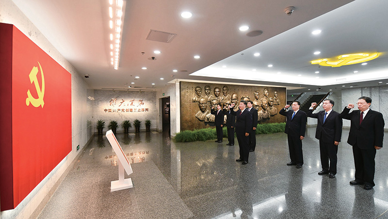 2017年10月31日,中共中央总书记、国家主席、中央军委主席习近平带领中共中央政治局常委李克强、栗战书、汪洋、王沪宁、赵乐际、韩正,瞻仰上海中共一大会址和浙江嘉兴南湖红船。这是31日上午,在上海中共一大会址纪念馆,习近平带领其他中共中央政治局常委同志一起重温入党誓词。