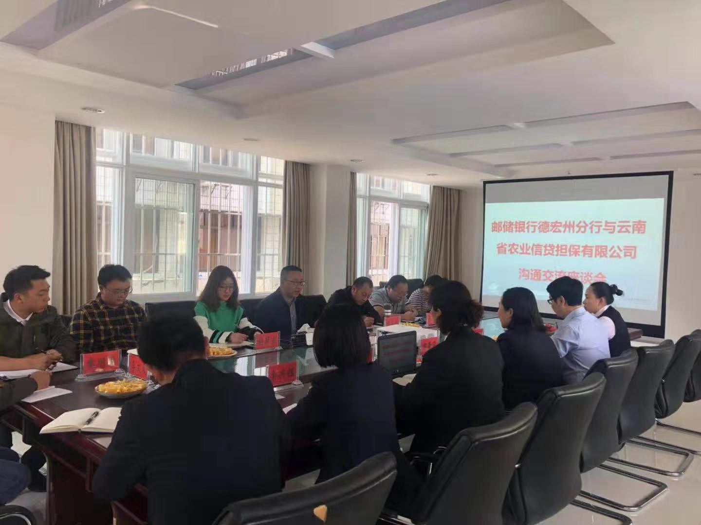 2019年2月19日下午,农担公司副总经理廖寅皓、风控部负责人张长浩、农担二部负责人贾万文、机构合作部负责人蔡菲带领德宏办事处人员至邮储银行德宏州分行,与邮储银行德宏州分行副行长郑素霞,小企业金融部总经理刘娜,个贷部总经理吴刚林进行交流座谈。