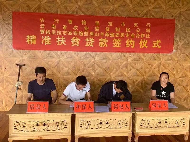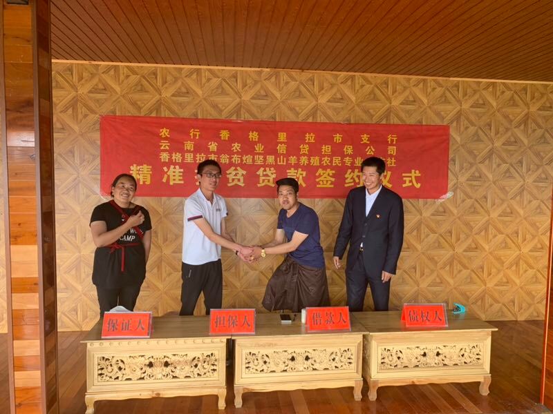 2019年6月25日,云南省农业信贷担保有限公司维西办事处工作成员与中国农业银行股份有限公司迪庆州分行相关负责人及领导一行到达香格里拉市五境乡仓觉村,与翁布煊坚黑山羊养殖农民专业合作社签署合同,由云南农担公司进行政策担保,为香格里拉市翁布煊坚黑山羊养殖农民专业合作社发放担保贷款200万元。