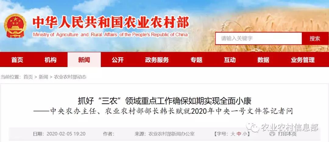 近日,中共中央、国务院印发《关于抓好“三农”领域重点工作确保如期实现全面小康的意见》,也就是2020年中央一号文件。文件公开发布之际,中央农办主任、农业农村部部长韩长赋就文件制定印发和贯彻落实等问题,回答了记者的提问。