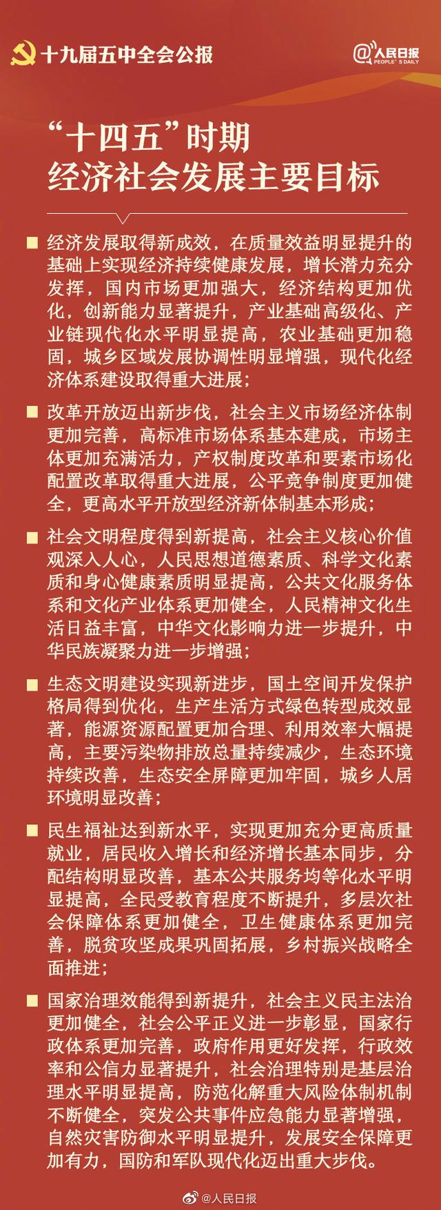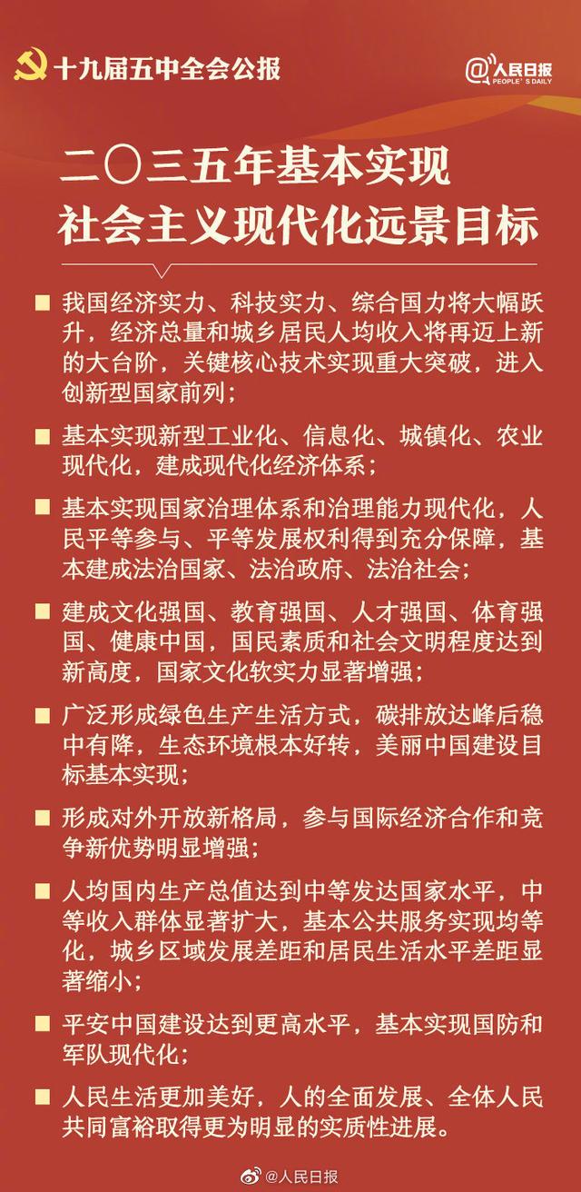 10月29日,中国共产党第十九届中央委员会第五次全体会议公报发布。全会高度评价决胜全面建成小康社会取得的决定性成就,提出了到二〇三五年基本实现社会主义现代化远景目标以及“十四五”时期经济社会发展主要目标。中国将如何实现这一宏伟蓝图,14个关键词速读五中全会公报。