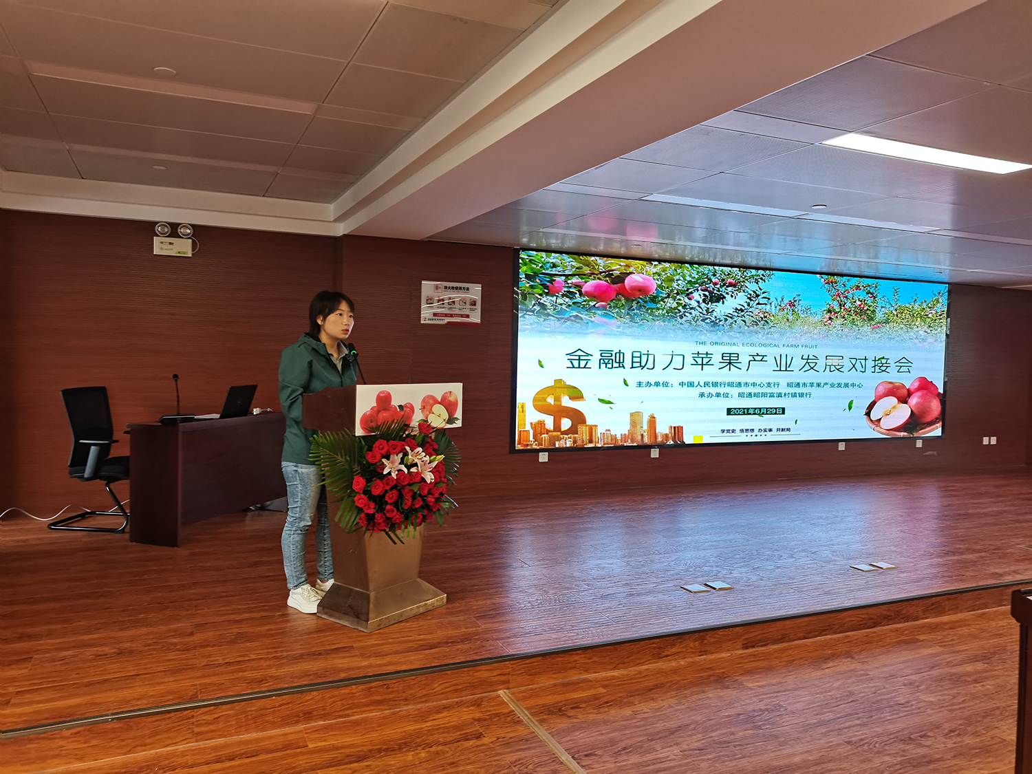 6月29日,昭通办事处负责人刘明晨、项目经理马挺应邀参加了由中国人民银行昭通市中心支行、昭通市苹果产业发展中心主办,昭通昭阳富滇村镇银行承办的“金融助力苹果产业发展对接会”。