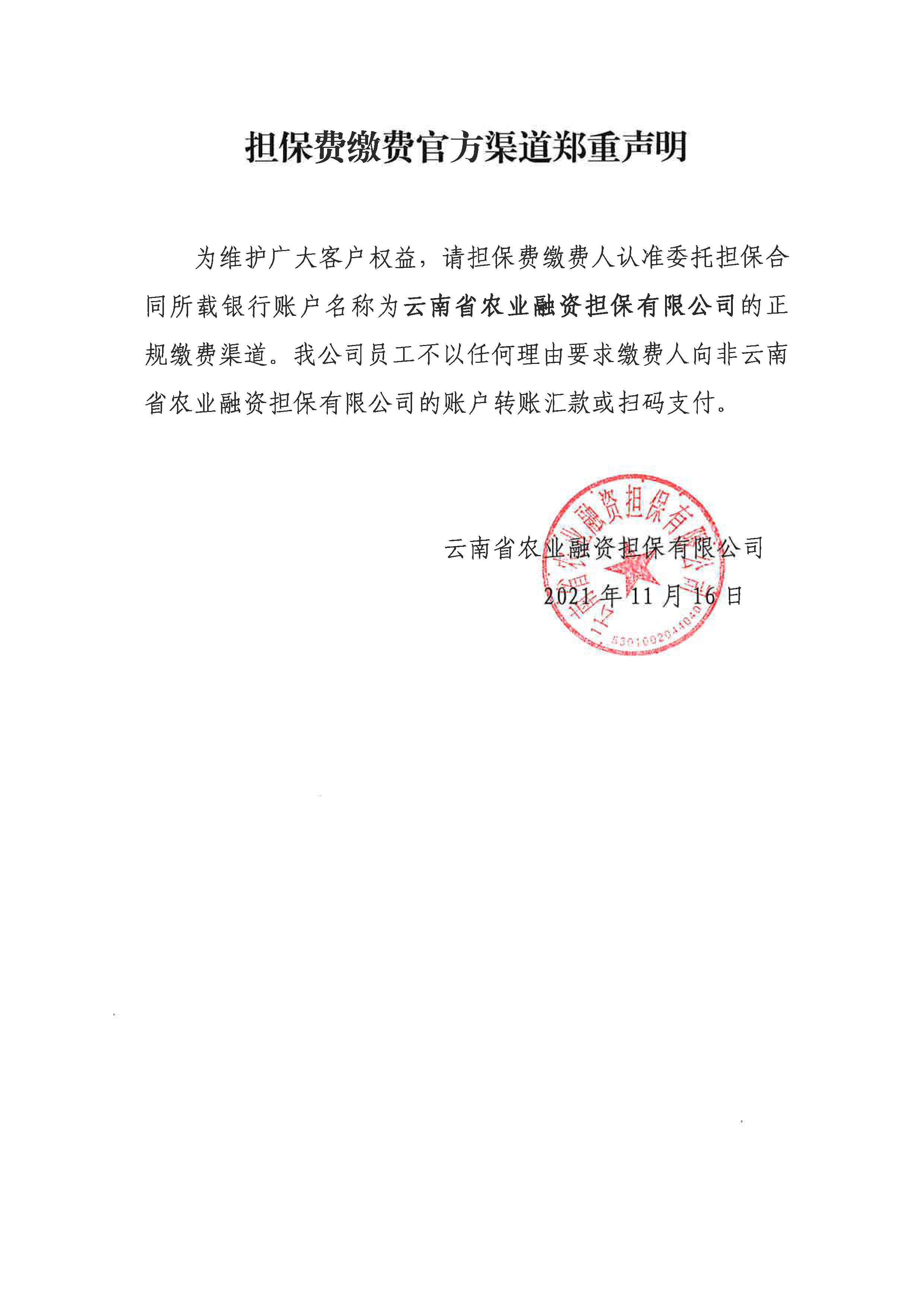 云南省农担公司担保费缴费官方渠道郑重声明