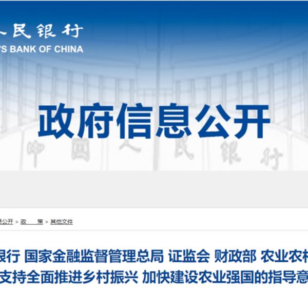 中国人民银行、金融监管总局、中国证监会、财政部、农业农村部近日联合发布《关于金融支持全面推进乡村振兴 加快建设农业强国的指导意见》。