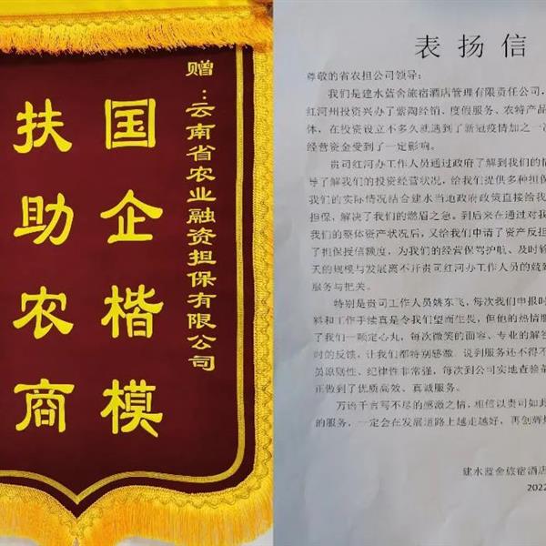 11月16日,milan.com收到担保客户建水蓝舍旅宿酒店管理有限责任公司送来的一封表扬信和一面印有“国企楷模 扶助农商”的锦旗,表达对云南农担公司...