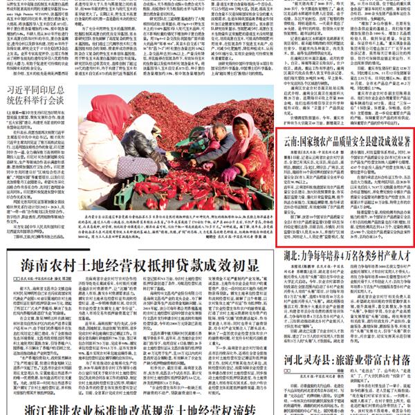 11月17日《农民日报》刊发文章报道云南的国家级农产品质量安全县建设取得良好成绩。