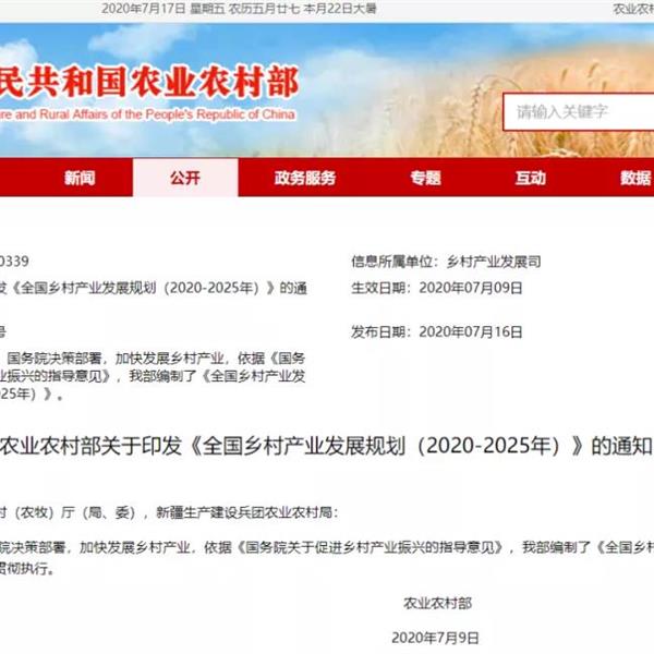 农业农村部印发《全国乡村产业发展规划(2020-2025年)》